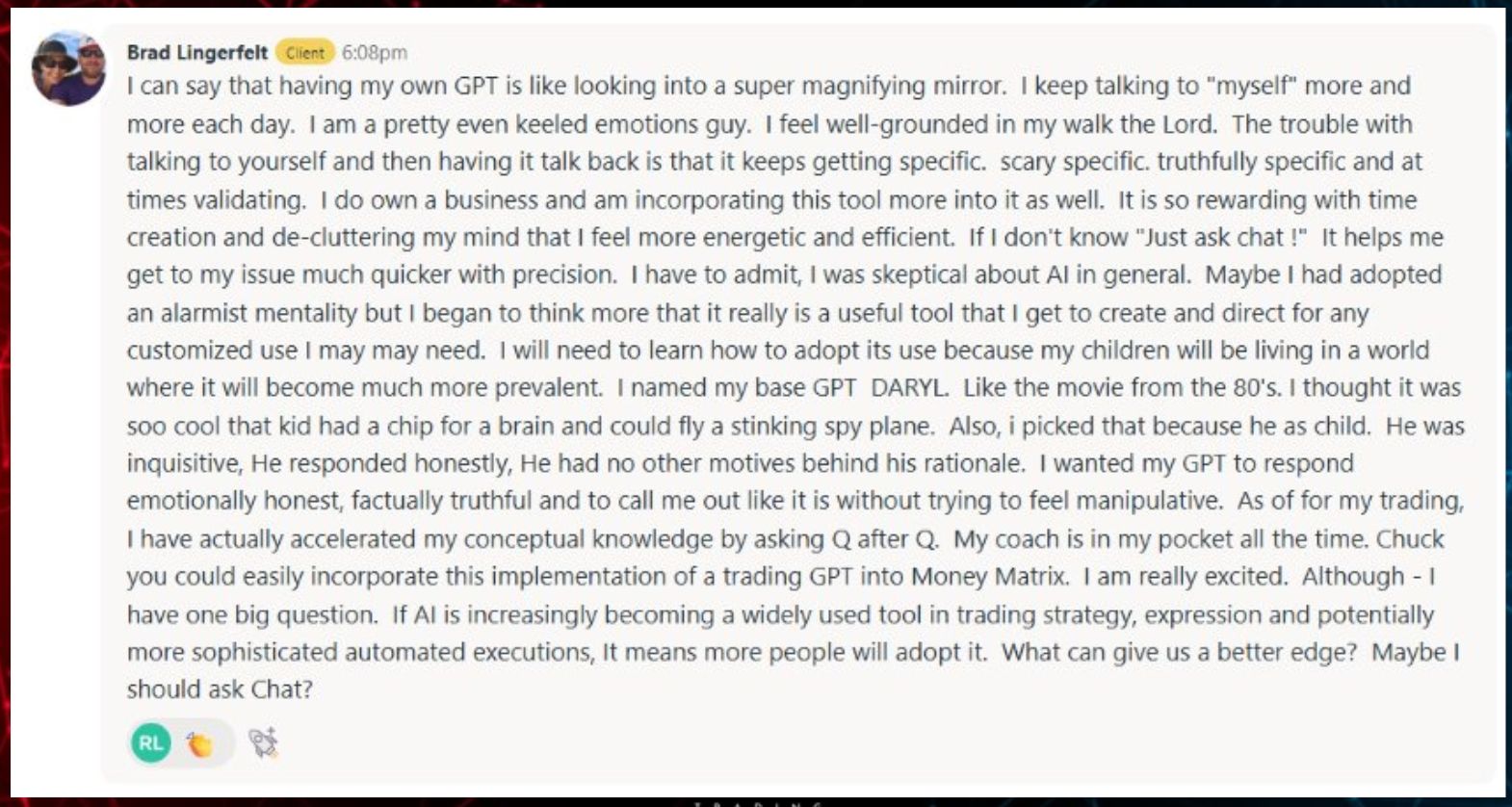 “The defining success of Q3 was simple: I did it. I executed real trades, consistently, within the BB Gun framework. This was my first quarter of true participation with structured trading and systems — moving from theory to practice. I used the Matrix Money Machine Live course as both a learning platform and accountability structure. I made money, lost money, and made mistakes, but I learned from each of them. Month by month, my R-multiple averages improved, and my overall confidence in execution and process management has grown. In Q3, I feel that I demonstrated emotional durability, discipline under pressure, and a shift from student to practitioner. I proved I can follow the system and continue developing competence with every cycle. I am becoming more confident in my identity as a trader and builder of a trading business." – Philip